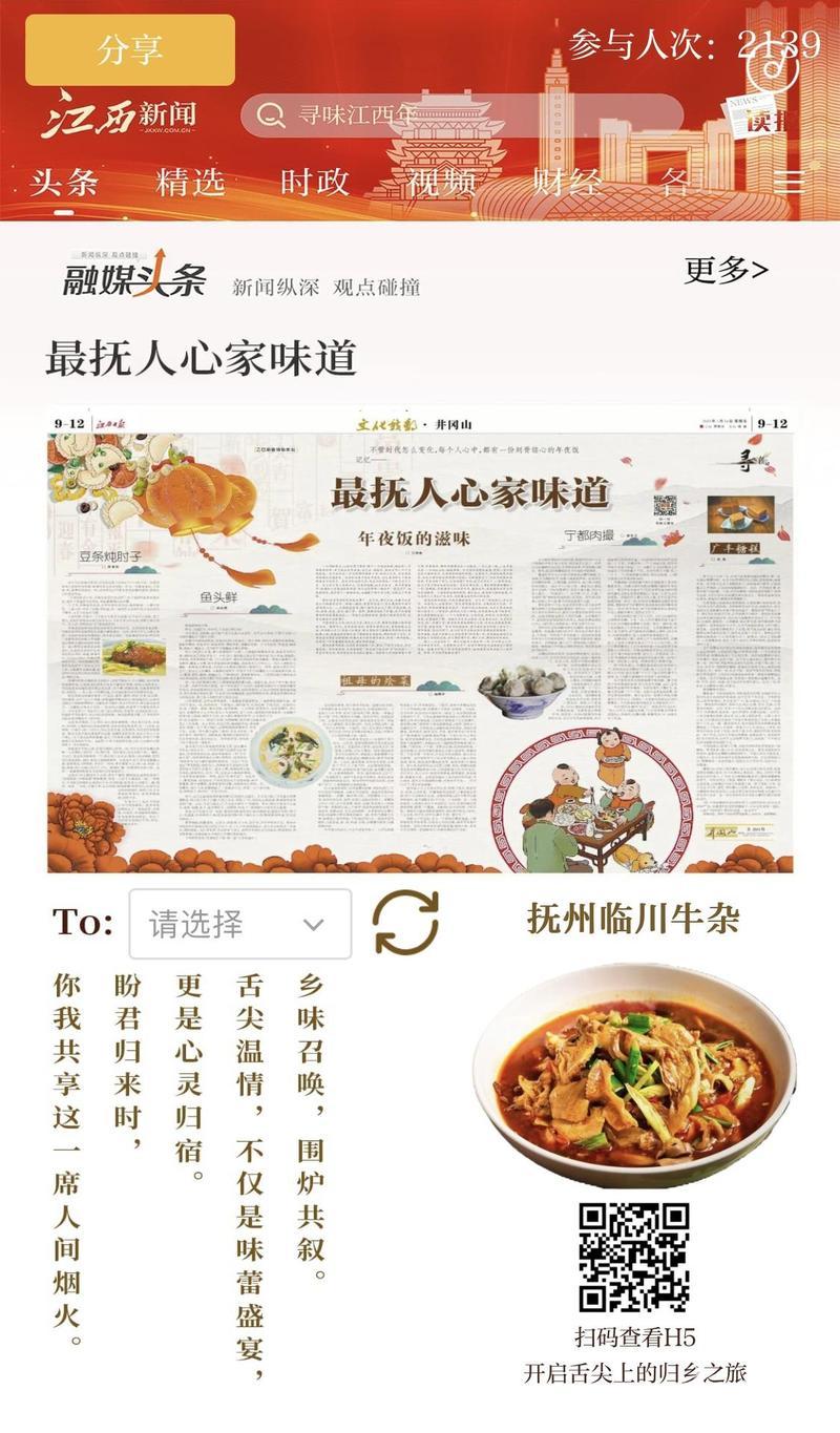 值得一提的是,《寻味江西年》中嵌入的创意视频,是根据刊登在江西日报上的文章,由AI制作生成。此外,在11个设区市年夜饭经典菜肴中,有不少是江西小炒热推菜品。这些菜品既家常又美味,每一道都独具特色,寓意着祝福和团圆,承载着人们对新年的期盼和祝愿,也展现了中国丰富多元的饮食文化。